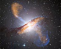 Boston MA (SPX) Feb 05, 2009 This image of Centaurus A shows a spectacular new view of a supermassive black hole's power. Jets and lobes powered by the central black hole in this nearby galaxy are shown by submillimeter data (colored orange) from the Atacama Pathfinder Experiment (APEX) telescope in Chile and X-ray data (colored blue) from the Chandra X-ray Observatory. Visible light data from the Wide Field Imager on the Max-Planck/ESO 2.2 m telescope, also located in Chile, shows the dust lane in the galaxy and background stars. The X-ray jet in the upper left extends for about 13,000 light years away from the black hole. The APEX data shows that material in the jet is travelling at about half the speed of light. Related Links Chandra X-ray Observatory Understanding Time and Space