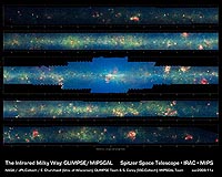 Los Angeles CA (SPX) Dec 04, 2009 More than 800,000 snapshots from NASA's Spitzer Space Telescope have been stitched together to create a new "coming of age" portrait of stars in our inner Milky Way galaxy. The image depicts an area of sky 120 degrees wide by two degrees tall. It was unveiled today at the 212th meeting of the American Astronomical Society in St. Louis, Mo. "This is the highest-resolution, largest, most sensitive infrared picture ever taken of our Milky Way," said Sean Carey of NASA's Spitzer Science Center at the California Institute of Technology, Pasadena, Calif. Carey is lead investigator for one of two teams responsible for the new picture. "Where previous surveys saw a single source of light, we now see a cluster of stars. With this data, we can learn how massive stars form, map galactic spiral arms and make a better estimate of our galaxy's star-formation rate," Carey explained. "I suspect that Spitzer's view of the galaxy is the best that we'll have for the foreseeable future. There is currently no mission planned that has both a wide field of view and the sensitivity needed to probe the Milky Way at these infrared wavelengths," said Barbara Whitney of the Space Science Institute, Madison, Wis. Whitney is a member of the second astronomy team. Because Earth sits inside our dusty, flat, disk-shaped Milky Way, we have an edge-on view of our galactic home. We see the Milky Way as a blurry, narrow band of light that stretches almost completely across the sky. With Spitzer's dust-piercing infrared eyes, astronomers peered 60,000 light-years away into this fuzzy band, called the galactic plane, and saw all the way to the other side of the galaxy. The result is a cosmic tapestry depicting an epic coming-of-age tale for stars. Areas hosting stellar embryos are identified by swaths of green, which are organic molecules, called polycyclic aromatic hydrocarbons, illuminated by light from nearby newborn stars. On Earth, these molecules are found in automobile exhaust and charred barbeque grills, essentially anywhere carbon molecules are burned incompletely. The regions where young stars reside are revealed as "bubbles," or curved ridges in the green clouds. These bubbles are carved by the winds from young starlets blowing away their natal dust. The starlets appear as yellow and red dots, and the wisps of red that fill most bubbles are composed of graphite dust particles, similar to very small pieces of pencil lead. Blue specks sprinkled throughout the photograph are individual older Milky Way stars. The bluish-white haze that hovers heavily in the middle two panels is starlight from the galaxy's older stellar population. A deep, careful examination of the image also shows the dusty remnants of dying and dead stars as translucent orange spheres. "With these Spitzer data, we've been able to catalogue more than 100 million stars," said Edward Churchwell of the University of Wisconsin, at Madison. Churchwell is principal investigator of one of the teams. "This picture shows us that our Milky Way galaxy is a crowded and dynamic place. We have a lot to learn. I've definitely found a lot of things in this map that I didn't expect to see," said Carey. This infrared composite incorporates observations from two Spitzer instruments. Data from the infrared array camera were collected and processed by The Galactic Legacy Infrared Mid-Plane Survey Extraordinaire team, led by Churchwell. The Multiband Imaging Photometer for Spitzer Galactic Plane Survey Legacy team, led by Carey, processed observations from Spitzer's multiband imaging photometer. Blue represents 3.6-micron light, green shows light of 8 microns and red is 24-micron light. Share This Article With Planet Earth