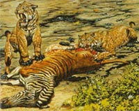 Los Angeles CA (SPX) Nov 06, 2008 The sabertooth cat (Smilodon fatalis), one of the most iconic extinct mammal species, was likely to be a social animal, living and hunting like lions today, according to new scientific research. The species is famous for its extremely long canine teeth, which reached up to seven inches in length and extended below the lower jaw. Instead of relying on the bones and teeth of the sabertooths to make their findings, scientists from UCLA and the Zoological Society of London concluded that the sabertooth cat was social by using a novel technique: They compared numbers of present-day carnivores competing for kills in Africa with those of mainly extinct species found in a North American fossil deposit. The research is published in the current issue of the Royal Society's journal Biology Letters (Oct. 28). Co-authors also included scientists from South Africa's Tshwane University of Technology and University of Pretoria. Smilodon existed in North and South America between 1.8 million and 10,000 years ago and is one of the most common species preserved at the Rancho La Brea tar pits of Los Angeles, a fossil deposit in which dying herbivores trapped in sticky asphalt attracted numerous dire wolves and sabertooth cats, some of which also died there. Because most living cats are solitary, controversy has persisted over the social life of Smilodon. The study reported in Biology Letters took a new approach to the question by comparing data from the La Brea fossil record and data obtained from "playbacks" used in Africa, in which the recorded calls of distressed prey and the sounds of lions and hyenas are used to attract carnivores. This technique has been used by scientists to estimate carnivore densities in eastern and southern Africa. Results showed that large social species made up a far larger proportion of the animals attracted than one would expect, considering their population size compared to other carnivores. Large social carnivores were, in fact, found to attend approximately 60 times more often than expected on the basis of relative abundance. When these results were compared with the records at the tar pits of California, the scientists found that the proportion of Smilodon records matched the proportion of the large social carnivores in the playbacks. "It absolutely makes sense that social species will predominate at carcasses, both now and in the past," said Blaire Van Valkenburgh, UCLA professor of ecology and evolutionary biology and senior author on the paper. "Why approach a situation where you are likely to encounter dangerous competitors without having a few friends along?" The same social advantage, she said, would apply to all scavengers, including early humans, who began consuming more meat about 2 million year ago, some of which they probably scavenged. Although commonly called the "sabertoothed tiger," the species is actually not closely related to the tiger, which is part of a different subfamily. However, the sabertooth cat was large and muscular, similar in size to a modern-day tiger. "The extinct sabertooth cat, Smilodon fatalis, has been something of an enigma, with almost nothing known of its behavior," said Chris Carbone, a senior research fellow at the Zoological Society of London and lead author of the paper. "This research allowed us to use the behavior of its present-day relatives to conclude that this extinct cat was more likely to roam in formidable gangs than as a secretive, solitary animal." Related Links University of California - Los Angeles Darwin Today At TerraDaily.com