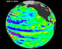 Adios El Nino, Hello La NinaPasadena CA (JPL) Jun 23, 2010 The latest image of Pacific Ocean sea surface heights from the NASA/European Ocean Surface Topography Mission/Jason-2 oceanography satellite, dated June 11, 2010, shows that the tropical Pacific has switched from warm (red) to cold (blue) during the last few months. The blue area in the center of the image depicts the recent appearance of cold water hugging the equator, which the satellite ... read more |