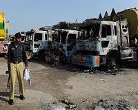One dead as at least 10 NATO tankers torched in PakistanQuetta, Pakistan (AFP) Oct 6, 2010 One person was killed Wednesday when at least 10 NATO oil tankers were set ablaze in the southwest Pakistan city of Quetta, senior police officials said - the fourth such attack in six days. Unknown gunmen attacked the terminal where up to 40 tankers were parked, and opened fire, senior police official Hamid Shakeel told AFP. "There are at least 10 tankers on fire. One person, apparentl ... read more |