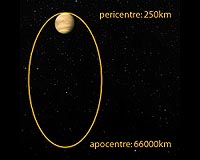 The initial Venus Express orbit (to scale). The eccentric orbit has its pericentre close to Venus's northern pole.